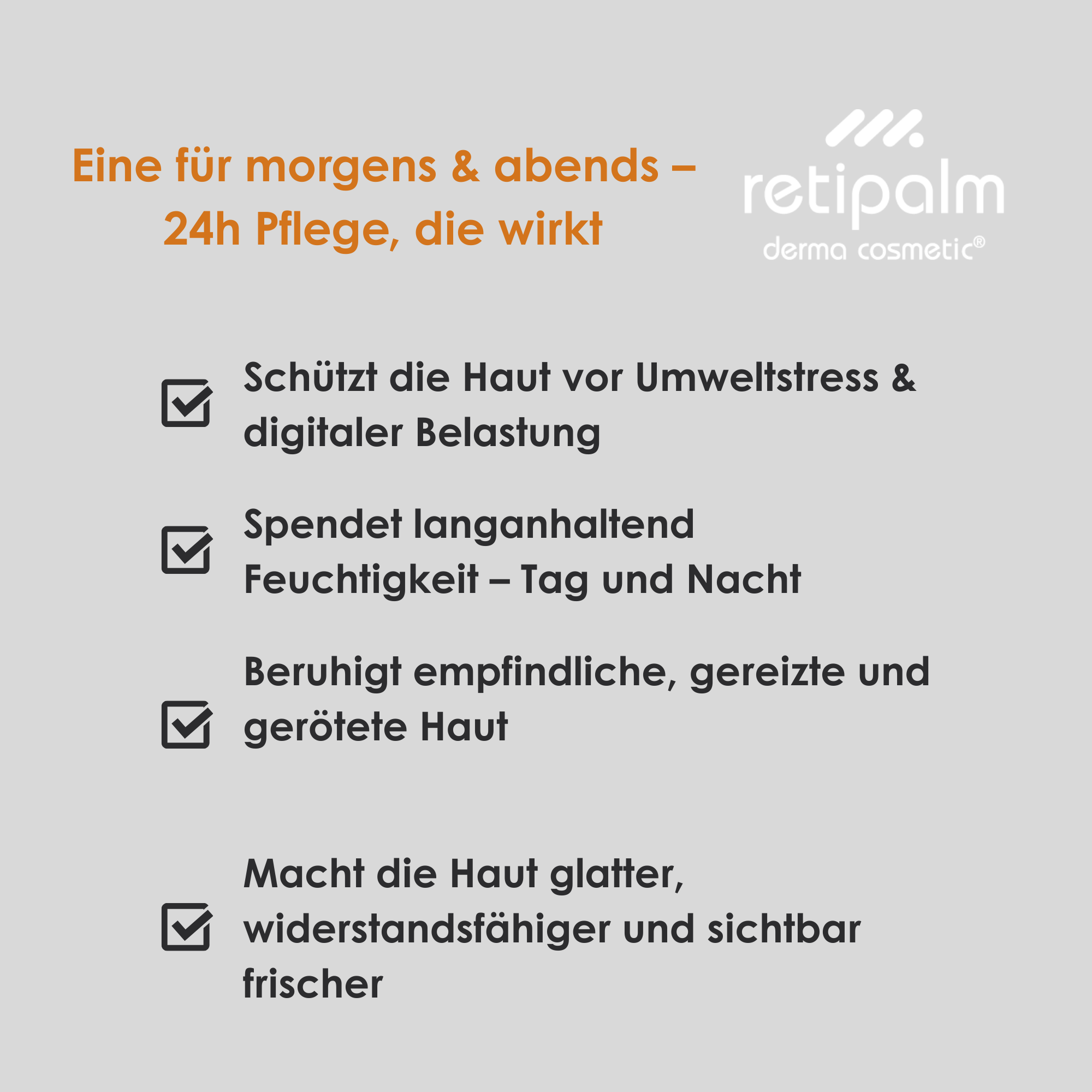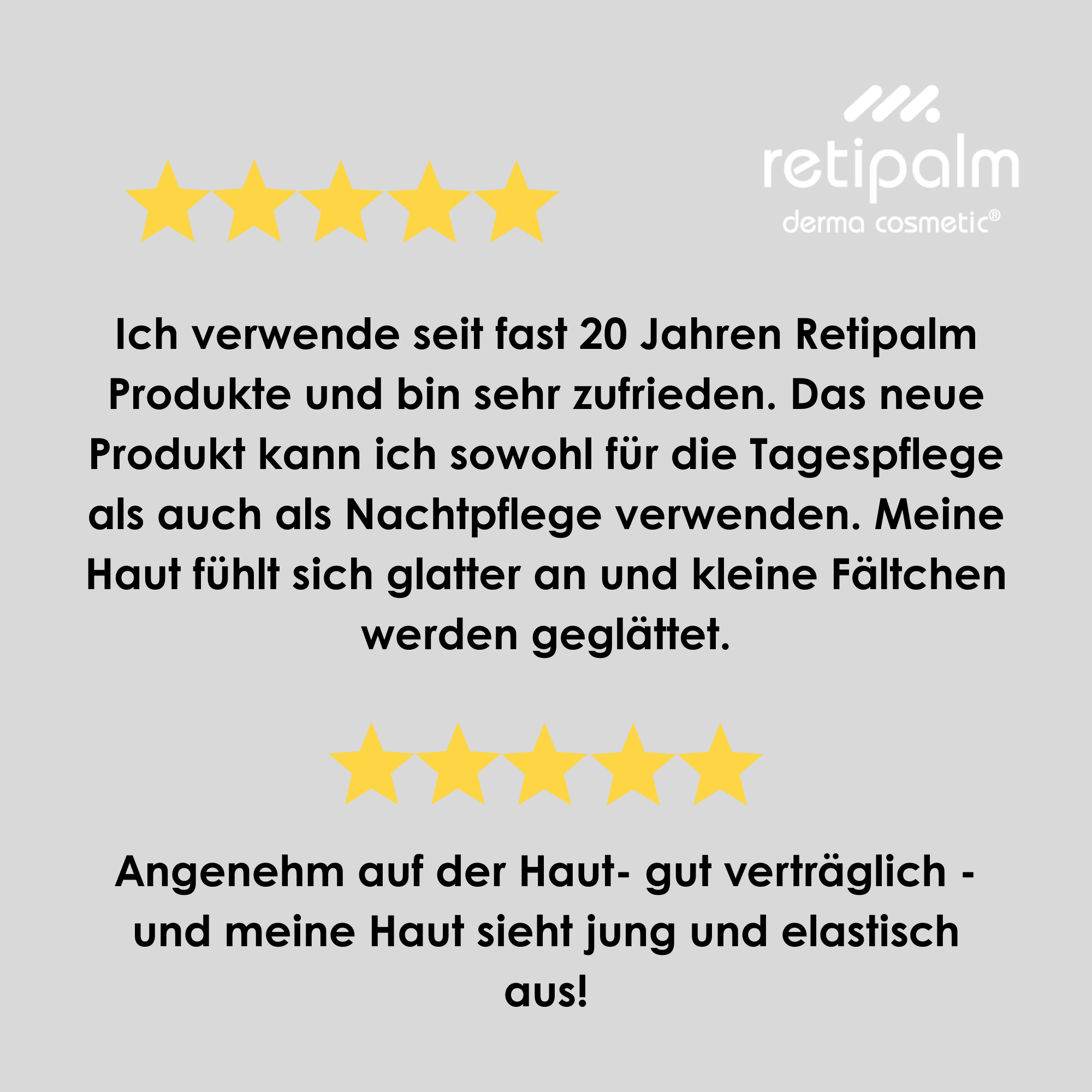 • Ich bin mit den Retipalmprodukten sehr zufrieden. Sie zaubern schon früh ein Lächeln ins Gesicht sobald der Duft vom Vitamin Hydrogel die Haut streichelt und verwöhnt.