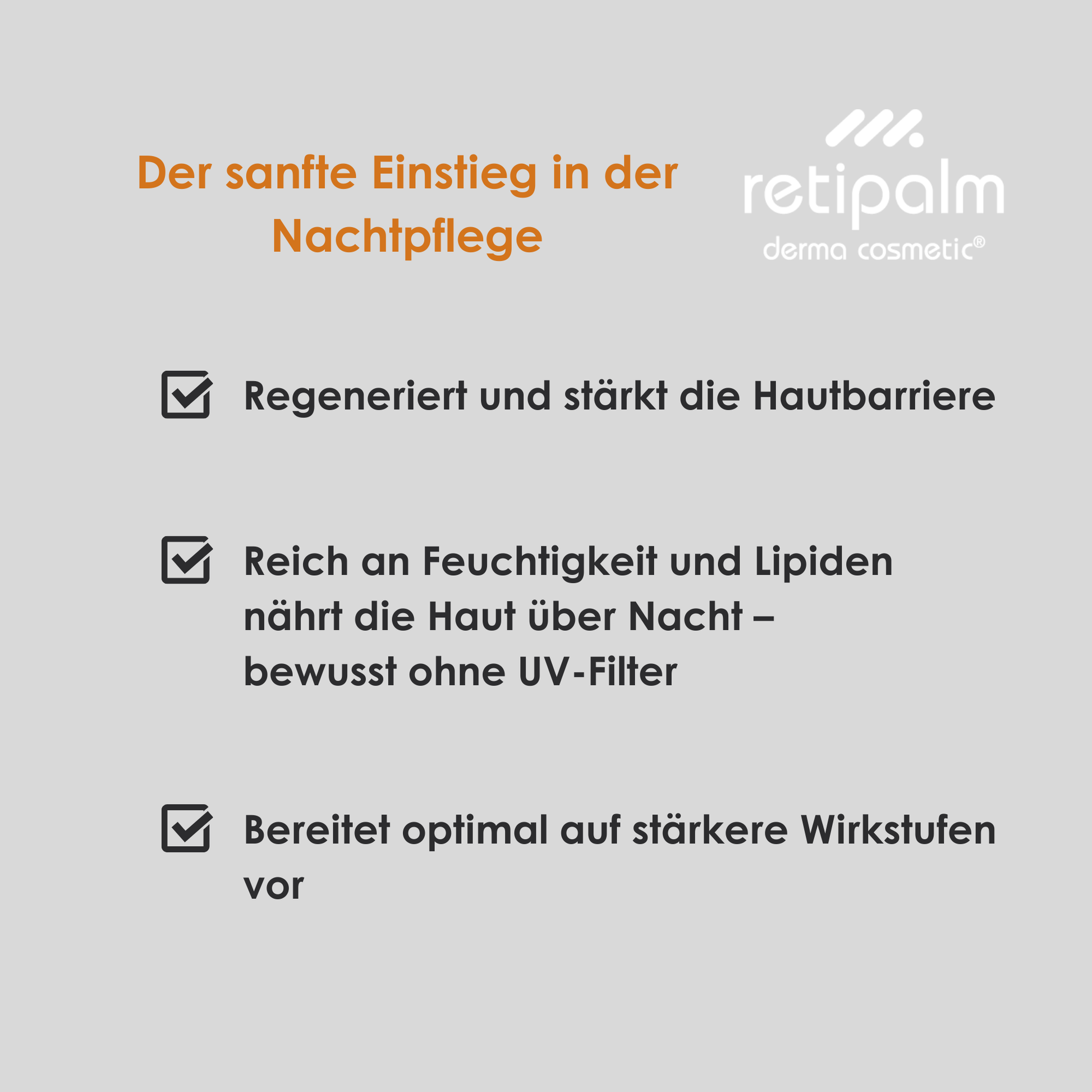 • Ich bin mit den Retipalmprodukten sehr zufrieden. Sie zaubern schon früh ein Lächeln ins Gesicht sobald der Duft vom Vitamin Hydrogel die Haut streichelt und verwöhnt.