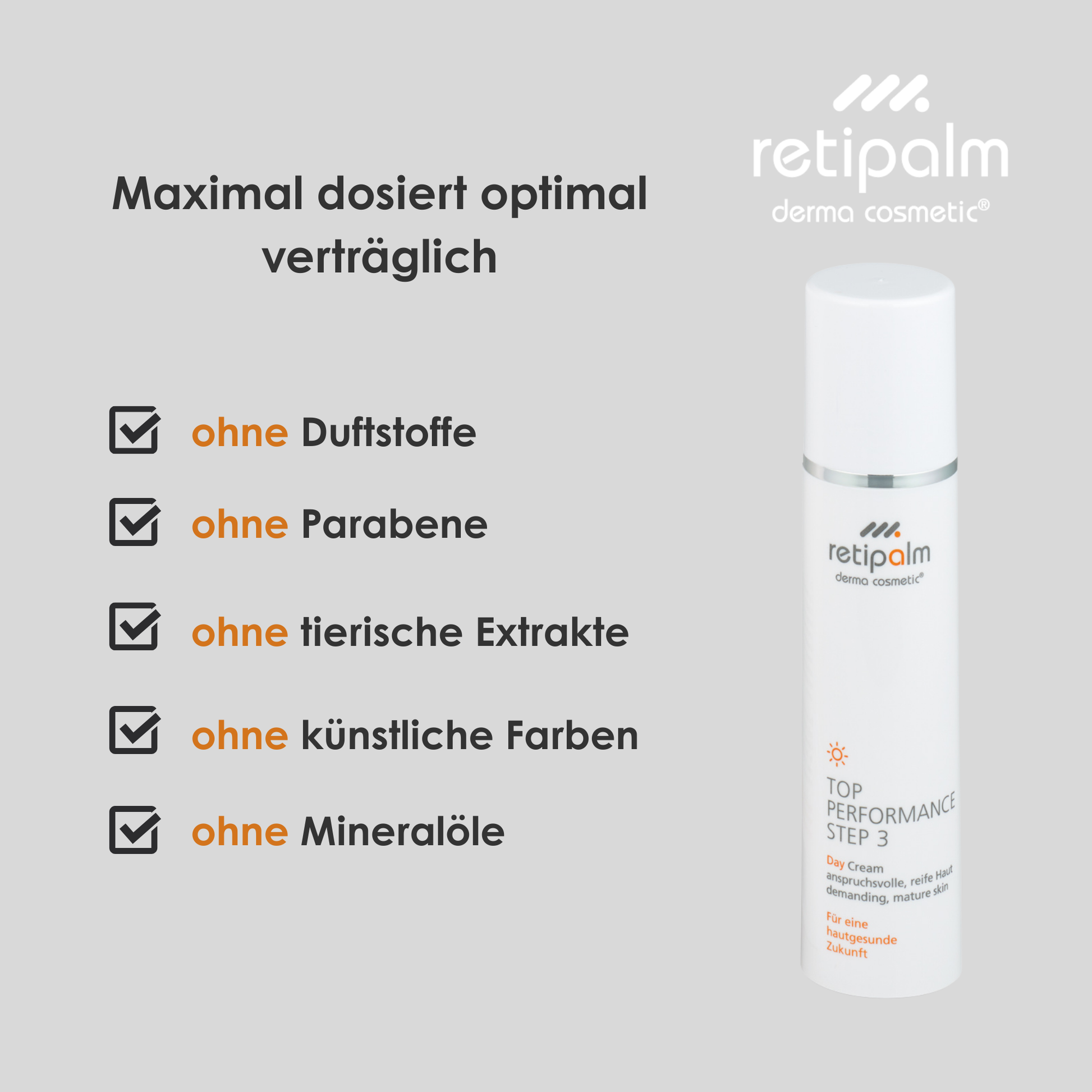 Top Performance Day Cream enthält eine hoch konzentrierte Kombination aus Vitamin A und Antioxidantien. Diese leistungsstarke Formel hilft, reife Haut zu glätten und zu stärken. Sie schützt die Haut vor tiefen Falten, Trockenheit und schädlichem UV-Licht.