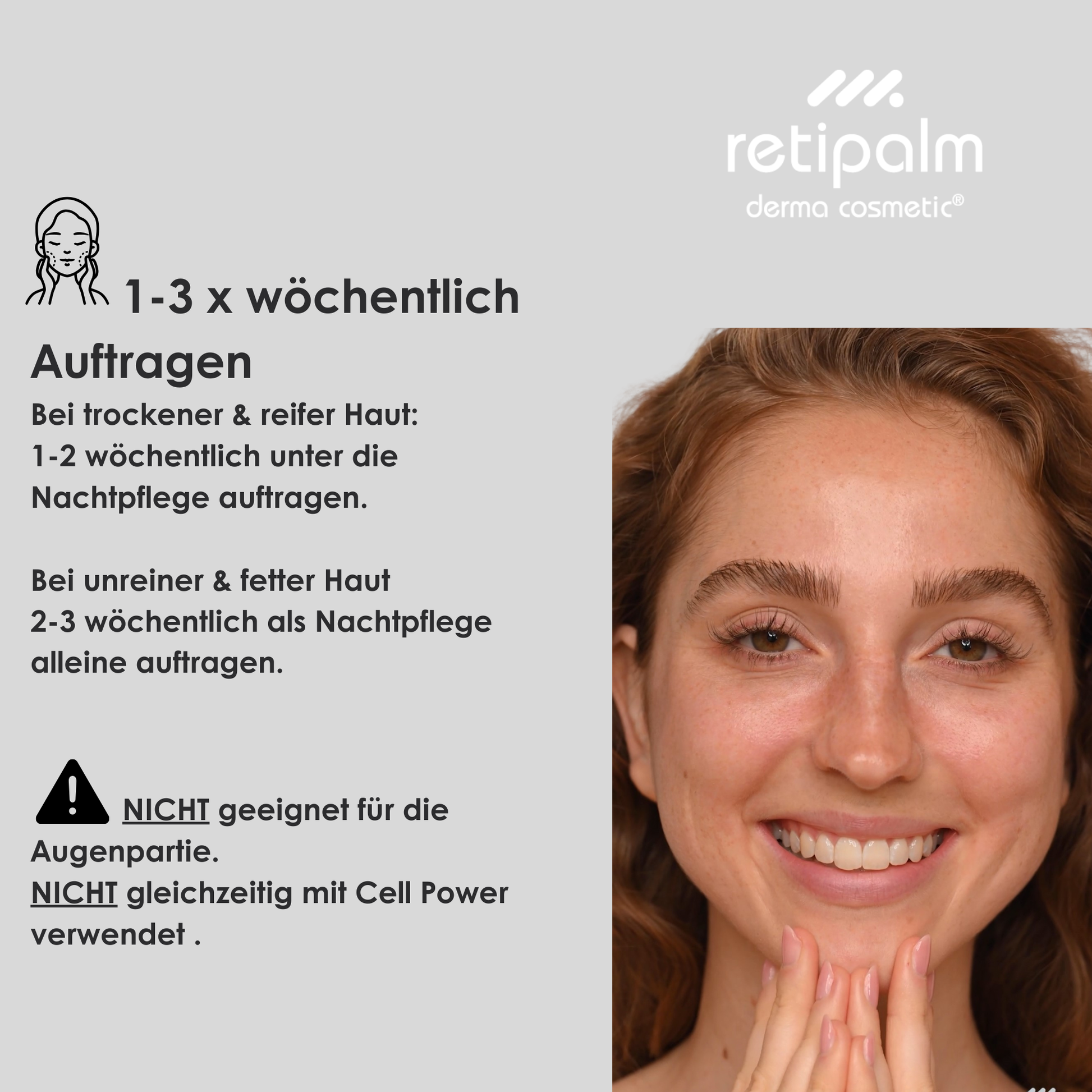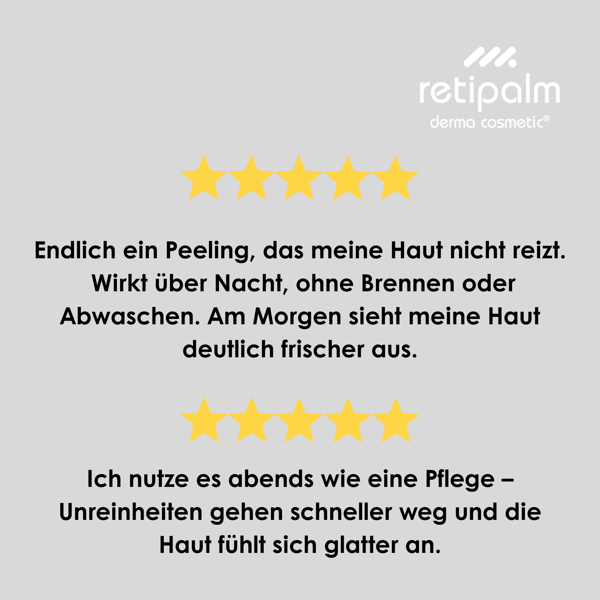 • Ich bin mit den Retipalmprodukten sehr zufrieden. Sie zaubern schon früh ein Lächeln ins Gesicht sobald der Duft vom Vitamin Hydrogel die Haut streichelt und verwöhnt.