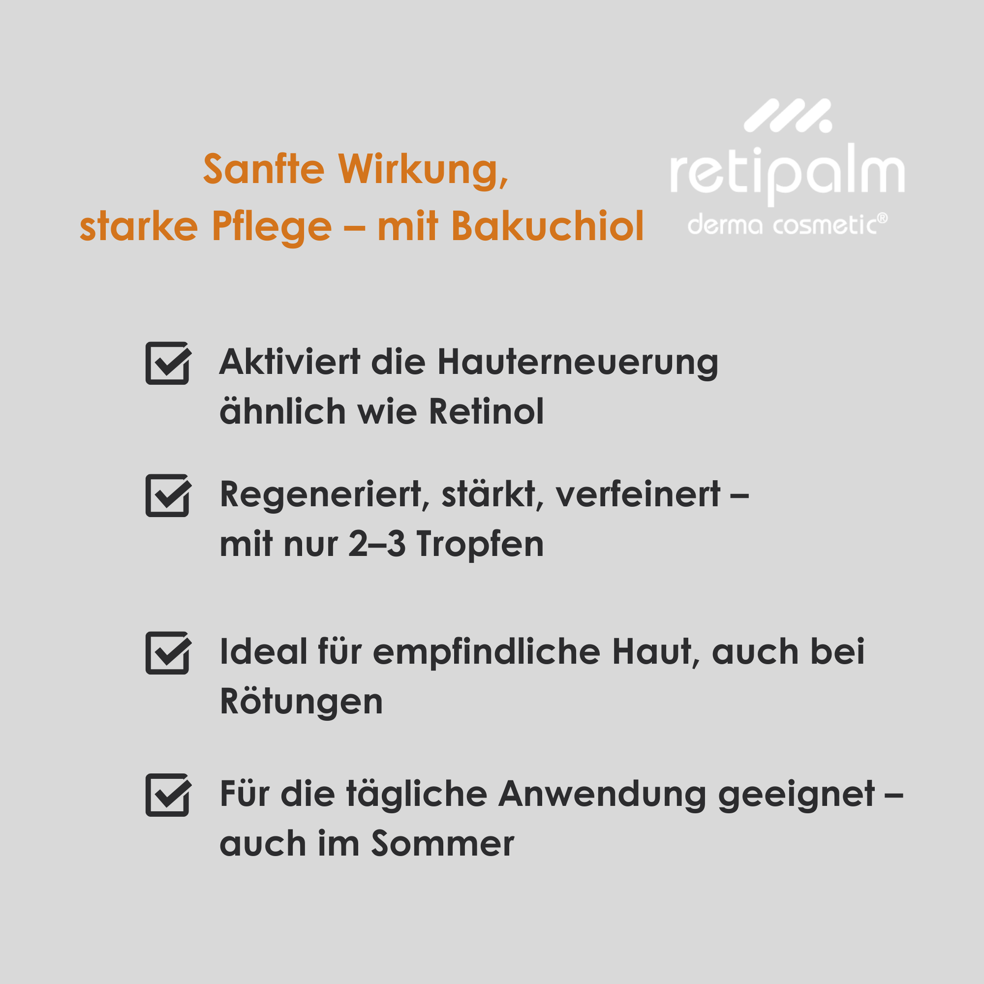 • Ich bin mit den Retipalmprodukten sehr zufrieden. Sie zaubern schon früh ein Lächeln ins Gesicht sobald der Duft vom Vitamin Hydrogel die Haut streichelt und verwöhnt.